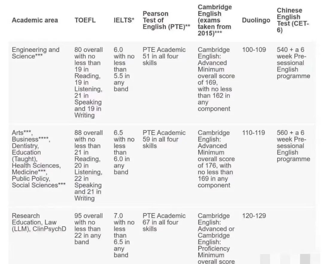 接受间隔期小于6个月的两次雅思考试成绩拼分,并且将认可的雅思/托福成绩有效期从入学前2年5个月调整为4年5个月(以上政策目前仅适用于2020年9月和2021年1月入学的学生)。