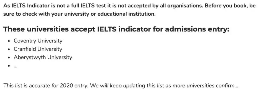 除了多领国,目前流行的IELTS Indicator也被至少3所英国院校接受,包括考文垂大学,克兰菲尔德大学,亚伯大学。
