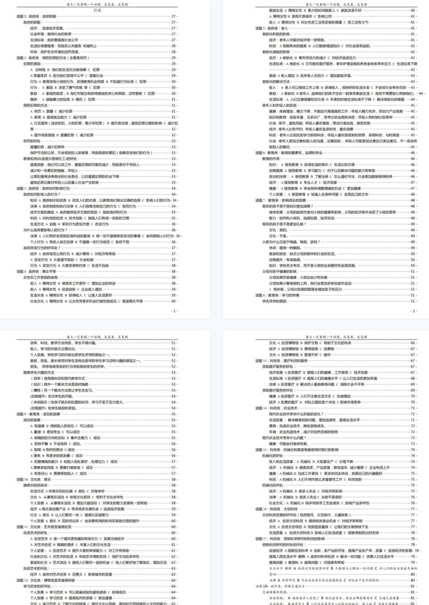 46个写作话题整理成了174页PDF,每个话题下还有细分的小话题,特别适合写作容易没思路的烤鸭们。坚持每天能刷一个话题,捋清楚逻辑、观点,熟记之后轻松拿高分!